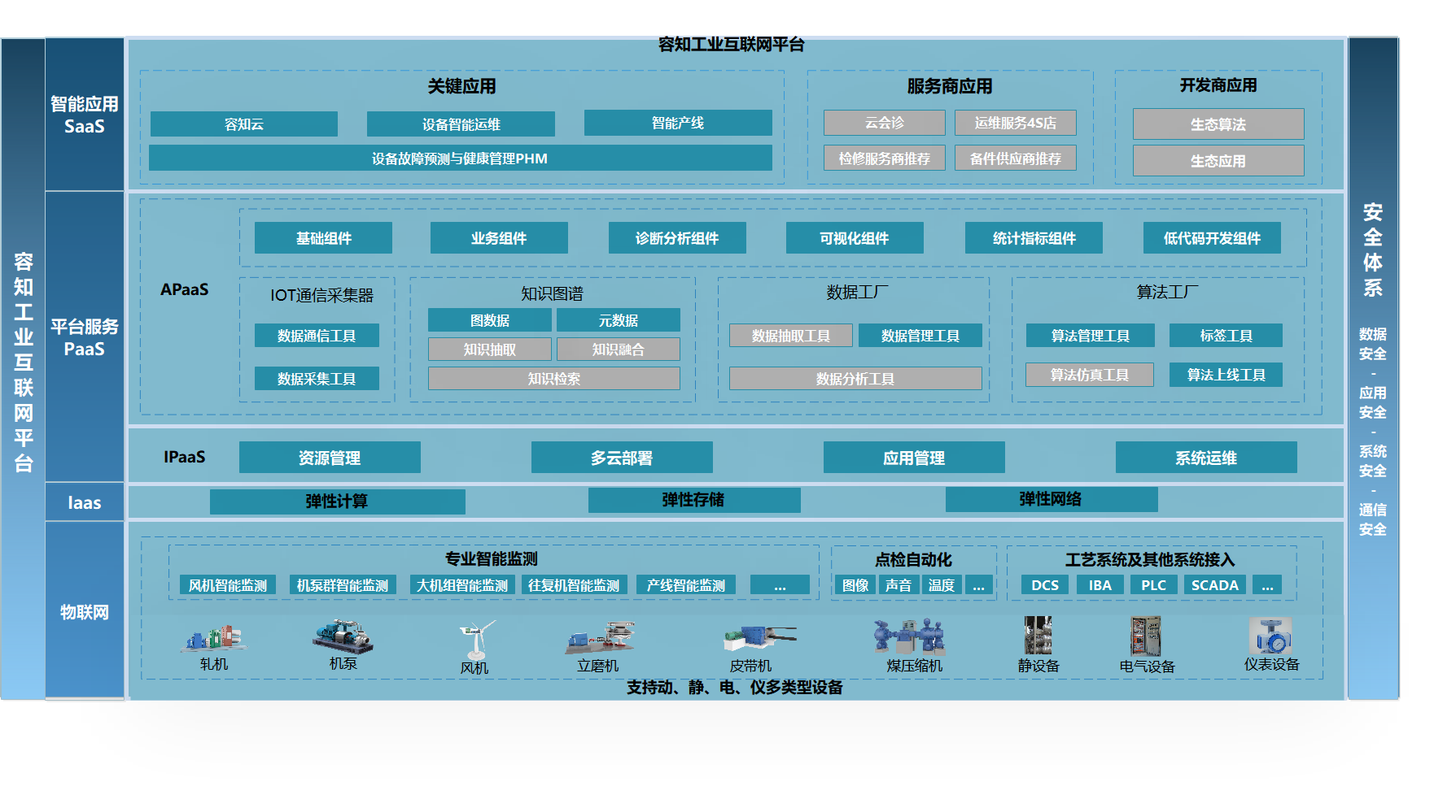 在IPaaS層,容知日新靈芝設備智能運維平臺采用CNCF認證的云原生技術,支持資源管理、系統監控、安全管理等IT運維能力,基于Helm3技術的應用程序商店,可以廣泛容納第三方應用;基于10年以上工業信息化解決方案的經驗,平臺自帶大量工業應用所需的IT組件,覆蓋數據庫、存儲、大數據、分布式計算等各個方面,并提供優化的配置參數,滿足第三方應用對IT基礎設施的需求;廣泛的適應性和架構靈活性,可以和企業基于云原生的PaaS平臺進行整合,符合企業統一平臺的要求。