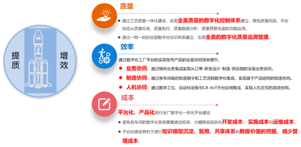 以航天裝備數(shù)字化為標桿,為高端裝備制造企業(yè)打造工具化、低成本、一站式的數(shù)字化升級產(chǎn)品生態(tài);打造裝備制造產(chǎn)業(yè)數(shù)據(jù)獲取、數(shù)據(jù)匯聚、數(shù)據(jù)賦能的工業(yè)大數(shù)據(jù)應(yīng)用創(chuàng)新平臺;形成裝備制造業(yè)智能化升級、服務(wù)化轉(zhuǎn)型、創(chuàng)新性設(shè)計的新一代信息技術(shù)創(chuàng)新應(yīng)用共享服務(wù)平臺,助力我國裝備制造業(yè)技術(shù)融合與產(chǎn)業(yè)升級。