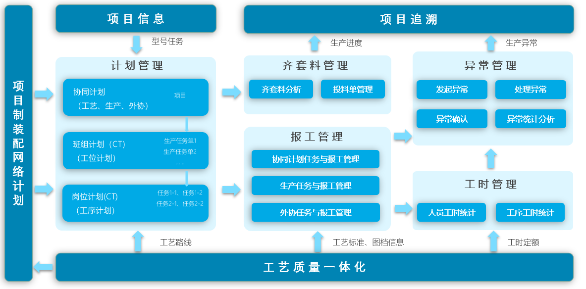以單發(fā)產(chǎn)品的生產(chǎn)作為項目,通過單發(fā)總裝過程模型為網(wǎng)絡(luò)計劃控制主線,并貫穿于項目管理的整個過程;基于物料一物一碼的標識編碼原則,從項目的立項開始到項目結(jié)束的全過程,其工藝文件發(fā)布、物料齊配套、設(shè)備工裝配套、生產(chǎn)進程等方面實現(xiàn)項目的全方位管理,使單發(fā)產(chǎn)品在總裝過程中信息化、透明化,可視化,從而實現(xiàn)總裝生產(chǎn)的脈動式和單元式的靈活切換,達到進度可控、風(fēng)險提前預(yù)警的管理要求,真正做到存在即可追溯。