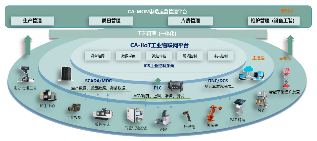 運用物聯(lián)網(wǎng)、邊緣計算、工業(yè)控制等先進互聯(lián)網(wǎng)技術(shù),建立CA-IIoT工業(yè)物聯(lián)網(wǎng)平臺,實現(xiàn)設(shè)備組網(wǎng)、數(shù)據(jù)采集、數(shù)控傳輸、現(xiàn)場控制、中央控制功能;基于5G通訊技術(shù)實現(xiàn)生產(chǎn)線業(yè)務(wù)層人、機、料、法、環(huán)、測各要素的數(shù)據(jù)連接、數(shù)據(jù)感知、數(shù)據(jù)采集、數(shù)據(jù)傳輸、數(shù)據(jù)存儲以及控制指令的下發(fā)。