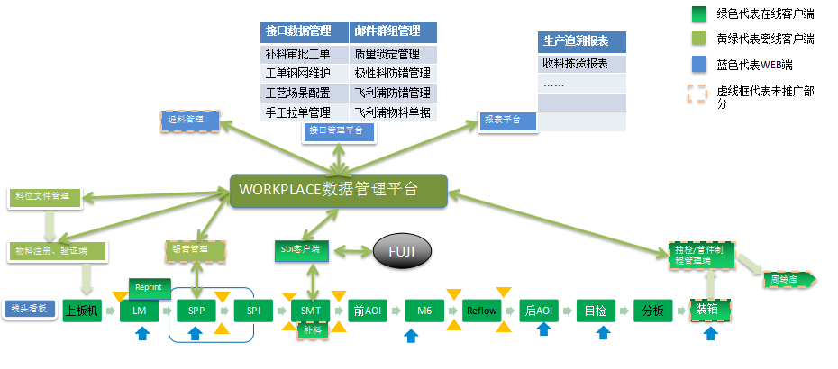 關鍵工位的采集數據都與板號關聯,基于設備實時聯機實現產品在制工序全程閉環制程控制、高精度的單板物料追溯、SPI/AOI檢測信息追溯、實現(印刷機、前后AOI、SPI和整SMT段)良率、直通率的統計管理,工位的作業數據、生產報警、故障報警等等。