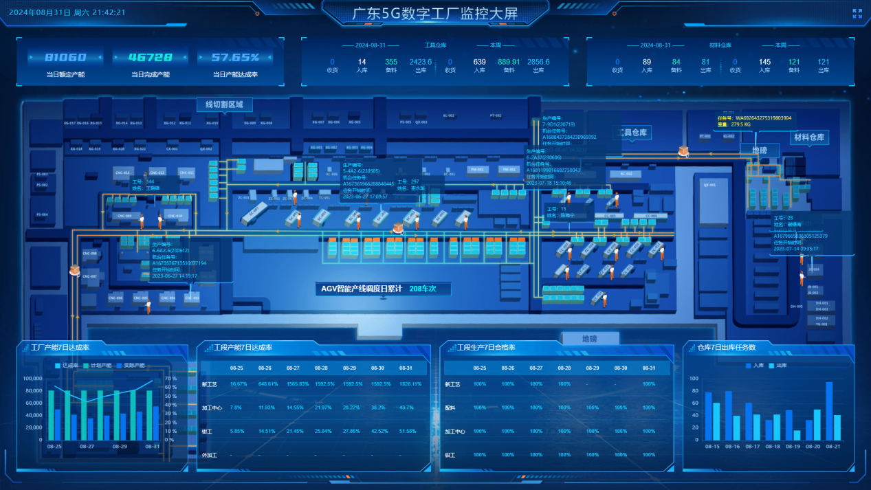 接收到生產(chǎn)訂單,根據(jù)設(shè)備5G聯(lián)機(jī)數(shù)據(jù)、訂單交期、各車間產(chǎn)能自動(dòng)進(jìn)行排產(chǎn),生產(chǎn)現(xiàn)場(chǎng)結(jié)合智造大腦提供數(shù)據(jù)進(jìn)行智能派工協(xié)同生產(chǎn),智造大腦“滴滴派單”模式減少現(xiàn)場(chǎng)班組長90%+協(xié)同工作,提升了柔性制造效率、產(chǎn)能。