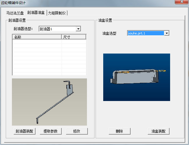 在選型界面可選擇需要的齒輪罩類型,類型可擴展。可通過“提取參數”功能,將當前模型中的數據提取到尺寸設計表中,可自定義相關尺寸,點擊“修改”可將當前值傳遞到模型。