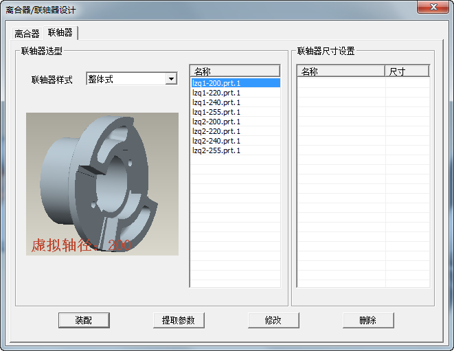 離合器選型。根據當前種類進行分類,當前分為:A型離合器、內漲式離合器與常規離合器,種類可擴展。在選型旁邊為參數列表,我們可通過此處修改模型尺寸。