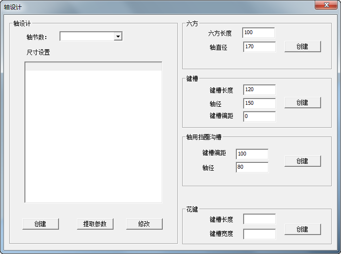 在軸設計界面,可以自定義一根軸,同時可以定義軸上的相關特征,如六方、鍵槽、軸用擋圈槽以及花鍵等,軸設計界面如下: