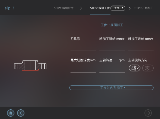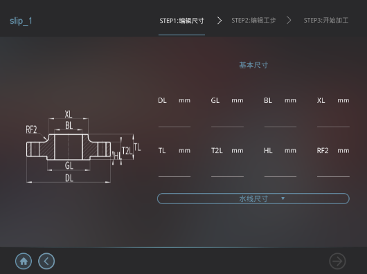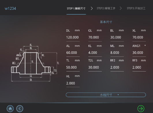 在新建程序模塊可以新建法蘭程序用于生產(chǎn)加工。首先,通過圖形化引導(dǎo)界面選擇法蘭類型,后根據(jù)需要選擇相應(yīng)加工工步,補(bǔ)充填寫工件尺寸、工藝參數(shù)等信息,一鍵生成可執(zhí)行程序,最后可直接運(yùn)行加工程序,進(jìn)行加工。
