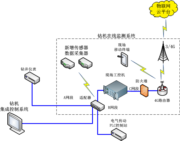 通過寄云NeuSeer Edge工業網關,從鉆機集成控制系統、鉆井儀表、電氣傳動PLC控制站以及新增的各種狀態傳感器等控制系統和傳感器中,通過OPC UA、ModBus、CAN、Profibus/Profinet等通信接口,讀取鉆井工藝參數、設備運行參數、運維管理參數等信息,通過MQTT發送到物聯網平臺。