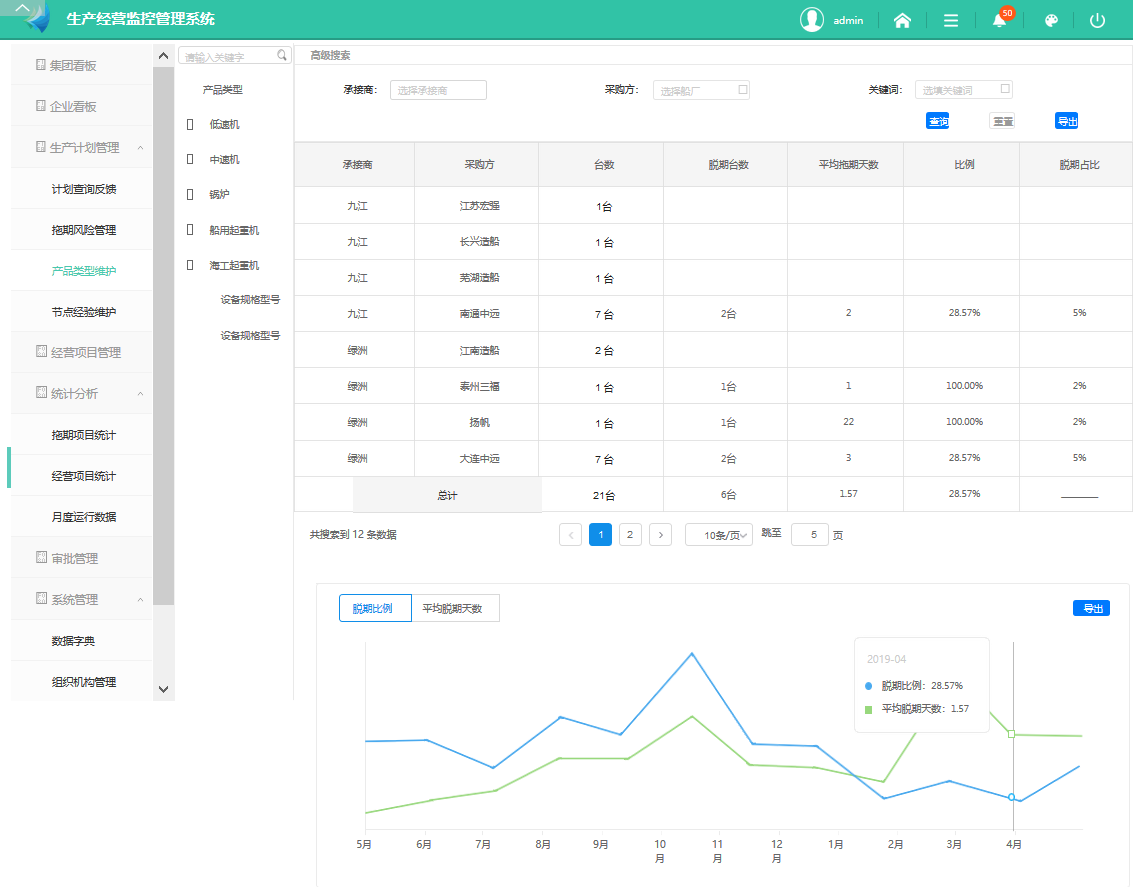 脫期項(xiàng)目統(tǒng)計(jì)主要基于產(chǎn)品類型、配套企業(yè)、采購方以及關(guān)鍵詞等,對(duì)脫期項(xiàng)目進(jìn)行篩選統(tǒng)計(jì),呈現(xiàn)脫期臺(tái)數(shù)、脫期天數(shù)、脫期比例、脫期占比等統(tǒng)計(jì)表格,并形成趨勢(shì)圖。拖期項(xiàng)目統(tǒng)計(jì)功能示意如下圖所示: