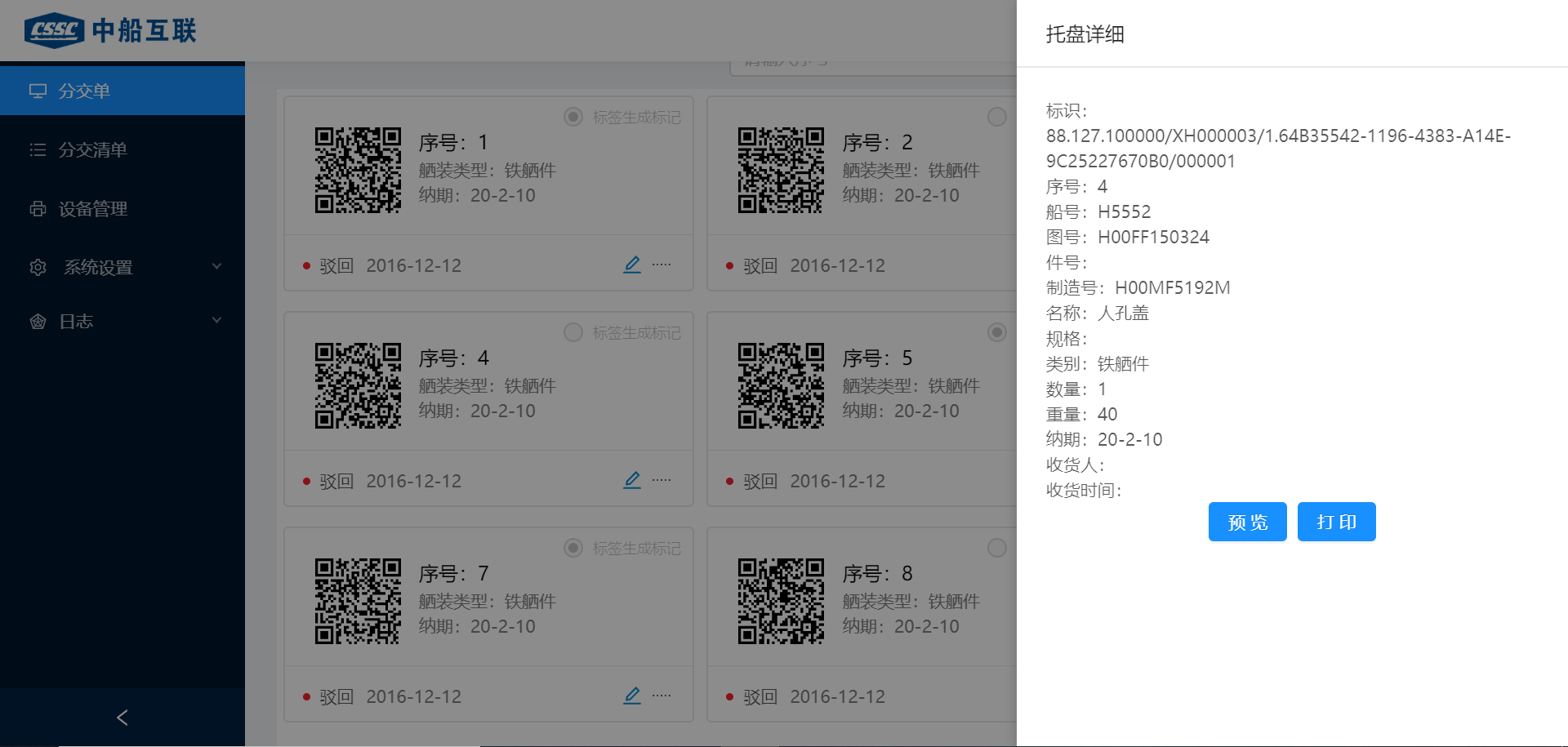 非標(biāo)件成品賦碼模塊結(jié)合工業(yè)互聯(lián)網(wǎng)標(biāo)識(shí)解析二級(jí)節(jié)點(diǎn),獲取在制非標(biāo)件編碼、屬性、圖紙等信息,并且通過與打印機(jī)、掃描設(shè)備等賦碼和標(biāo)識(shí)識(shí)別設(shè)備集成,實(shí)現(xiàn)標(biāo)識(shí)的快速打印,同時(shí)通過打印信息與生產(chǎn)制造信息的集成,實(shí)現(xiàn)配套企業(yè)生產(chǎn)制造狀態(tài)的實(shí)時(shí)在線反饋。其系統(tǒng)界面如下圖所示: