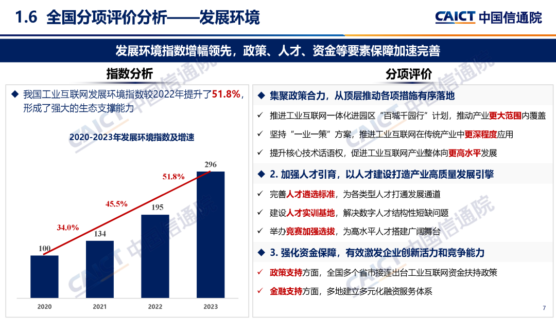 1. 全國工業(yè)互聯(lián)網(wǎng)發(fā)展成效指數(shù)顯示,我國工業(yè)互聯(lián)網(wǎng)進(jìn)入全面推進(jìn)的快速增長期。基礎(chǔ)能力指數(shù)連續(xù)三年高速增長,從“規(guī)模擴(kuò)張”向“質(zhì)量提升、結(jié)構(gòu)優(yōu)化、功能升級(jí)”轉(zhuǎn)變;技術(shù)創(chuàng)新指數(shù)穩(wěn)步提升,新領(lǐng)域創(chuàng)新突破助力“換道超車”;產(chǎn)業(yè)發(fā)展指數(shù)增長提速,產(chǎn)業(yè)從舊到新、從小到大、從弱到強(qiáng)邁進(jìn);應(yīng)用推廣指數(shù)穩(wěn)定增長,由“全面探索”轉(zhuǎn)向“場景推廣、鏈?zhǔn)睫D(zhuǎn)型”;發(fā)展環(huán)境指數(shù)增幅領(lǐng)先,政策、人才、資金等要素保障加速完善。