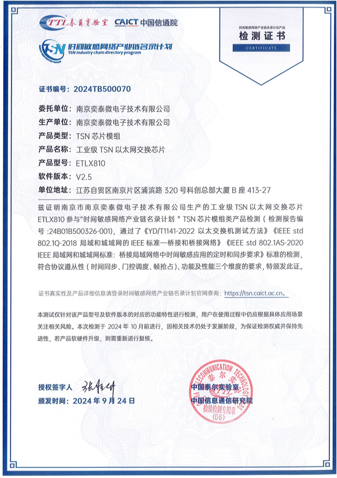 2024年9月,南京奕泰微電子技術(shù)有限公司(以下簡稱奕泰微)研發(fā)的ETL810型工業(yè)以太網(wǎng)TSN交換芯片,在互聯(lián)網(wǎng)與工業(yè)融合創(chuàng)新工信部重點(diǎn)實(shí)驗(yàn)室順利通過名錄計劃產(chǎn)品評測,獲得芯片模組類檢測證書。