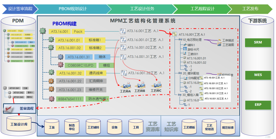 場景描述:以工藝平臺為載體,結構化管理工藝資源數據,向上對接研發數據管理的PLM,向下對接MES、ERP、SRM等系統,實現研發-工藝-制造的全數字化流程貫通,打破跨部門協作的壁壘,有效支撐研發設計與工藝更改協同,確保工藝更改閉環,提升鋰電池生產效率。