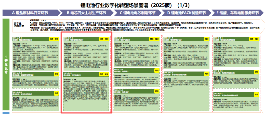 工業和信息化部9月16日印發《場景化、圖譜化推進重點行業數字化轉型的參考指引(2025版)》,其附件中給出14個行業場景圖譜(2025版),為各行業數字化轉型應用實踐提供了方法指引。鋰電池行業數字化轉型場景圖譜涉及研發設計、生產制造、運維服務、經營管理、供應鏈管理等5個關鍵環節、73個典型場景。現對鋰電池行業的典型場景進行解讀。