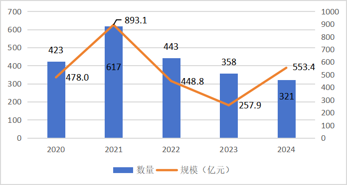 2020-2024年工業互聯網領域投融資事件數量與規模