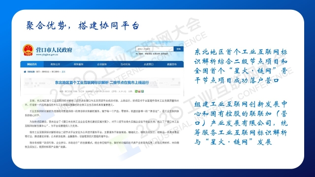點擊以下鏈接查看演講視頻: 專家說 “營口將發(fā)揮好“船小好調(diào)頭”的特點,在工業(yè)互聯(lián)網(wǎng)、區(qū)塊鏈等技術(shù)、新模式上創(chuàng)新探索,努力形成典型經(jīng)驗,為東北地區(qū)乃至全國提供有價值的樣本參考。一是通過標識解析+區(qū)塊鏈,打造智能制造之城;二是通過VR+虛擬園區(qū),打造虛擬現(xiàn)實之城;三是通過可信標識+數(shù)字貨幣,打造數(shù)字金融之城;四是通過城市大腦加神經(jīng)網(wǎng)絡(luò),打造智慧治理之城。” 以下是演講PPT 敬請閱讀