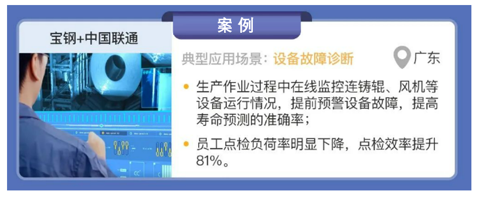寶鋼與中國聯通合作,在廣東省湛江市開展“流程行業 5G+工業互聯網高質量網絡和公共服務平臺”項目建設,利用 5G 技術實現了連鑄輥、風機等備故障診斷場景的應用。采集連鑄編碼、位置、所處區段受到的熱沖擊溫度、所處區段的夾緊力與鑄坯重力的合力等數據,通過5G網絡實時傳輸至設備故障診斷等相關系統,采用人工智能和大數據技術對不同區段的連鑄輥的壽命進行預測,減少了現場布線的工作量,提高了壽命預測的準確率。同時,采集風機振動、電流、電壓、溫度、風量等運行數據,通過5G網絡實時傳輸至設備故障診斷等相關系統,實現生產作業過程中風機設備運行情況的在線監控,提前預警設備故障,通過對風機設備的在線監控,員工點檢負荷率明顯下降,點檢效率提升 81%。