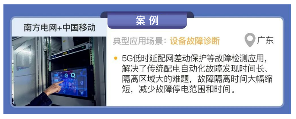 南方電網與中國移動合作,在廣東省廣州市開展了“5G+智能電網”項目建設,實現了設備故障診斷場景的應用。在配網差動保護應用中,利用電力專用5G用戶前置設備(CPE)進行高精度網絡授時,通過5G網絡低時延特性,采集配電網電流相量數據,傳輸至配電自動化主站,及時掌握線路情況,并進行在線監測和診斷,發現故障區段后,依靠配電自動化主站進行故障隔離和供電恢復,解決了傳統配電自動化故障發現時間長、故障隔離區域大的問題,將故障隔離時間大幅縮短,最大程度減少故障停電范圍和時間。