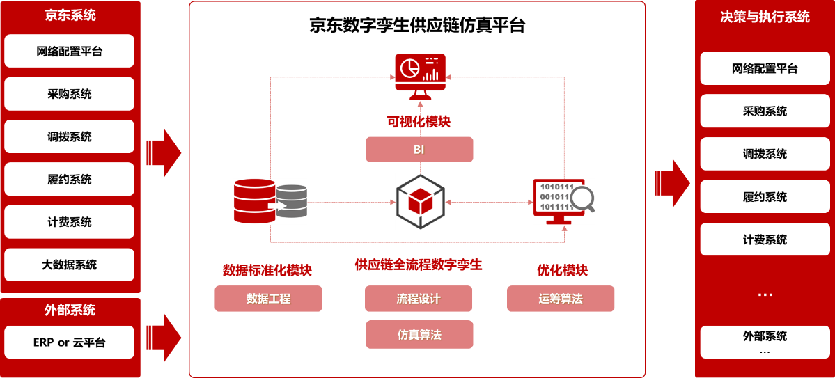 京東數(shù)字孿生供應(yīng)鏈仿真平臺(tái)允許業(yè)務(wù)對(duì)現(xiàn)狀的生產(chǎn)系統(tǒng)及業(yè)務(wù)流程進(jìn)行數(shù)字建模,同時(shí)也支持業(yè)務(wù)對(duì)未來可能的供應(yīng)鏈模式進(jìn)行流程設(shè)計(jì),評(píng)估新流程的可行性及優(yōu)化結(jié)果。基于對(duì)不同策略仿真結(jié)果的分析,最終將優(yōu)化后的策略落實(shí)到執(zhí)行系統(tǒng)進(jìn)行實(shí)施。京東供應(yīng)鏈仿真平臺(tái)搭建了一套標(biāo)準(zhǔn)化的供應(yīng)鏈框架,為了能夠靈活適配零售不同業(yè)務(wù)模式及不同行業(yè)特性,以模塊化的形式進(jìn)行了產(chǎn)品架構(gòu)設(shè)計(jì),各模塊彼此解耦,獨(dú)立迭代,可以支持豐富的應(yīng)用場(chǎng)景。