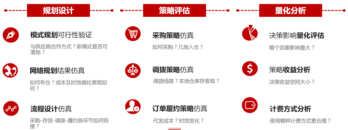數(shù)字孿生供應(yīng)鏈仿真平臺(tái)的核心能力主要分為三大方面,包括針對(duì)供應(yīng)鏈的規(guī)劃設(shè)計(jì)、不同環(huán)節(jié)的策略評(píng)估、以及相應(yīng)的量化分析,三大能力相互連接,由廣泛到精細(xì)。在規(guī)劃設(shè)計(jì)方面,主要涉及模式選擇、網(wǎng)絡(luò)規(guī)劃、倉網(wǎng)部署、全流程銜接的仿真等;在策略評(píng)估方面,包括各個(gè)供應(yīng)鏈環(huán)節(jié)的策略的仿真模擬,用于指導(dǎo)供應(yīng)鏈的計(jì)劃與執(zhí)行;在量化分析方面,能夠?qū)Σ煌h(huán)節(jié)的決策因子進(jìn)行分析,衡量策略的收益等。