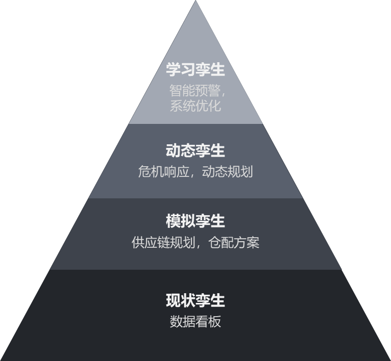 根據(jù)業(yè)務(wù)需求、能力差異、技術(shù)水平等方面,可以將數(shù)字孿生供應(yīng)鏈仿真平臺(tái)分為四個(gè)階段,從下往上依次是現(xiàn)狀孿生、模擬孿生、動(dòng)態(tài)孿生、學(xué)習(xí)孿生。