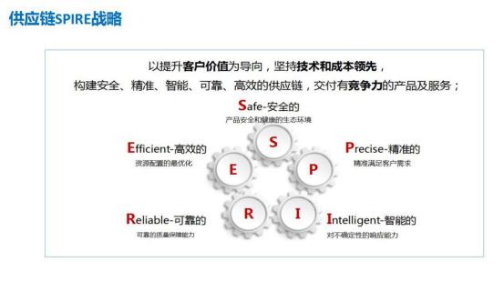 中興通訊在 2018 年 11 月發布了 SPIRE 供應鏈戰略 ,在戰略中我們明確要以提升 客戶價值為導向 ,堅持技術和成本領先 ,構建安全、精準、智能、可靠、高效的供應鏈 ,