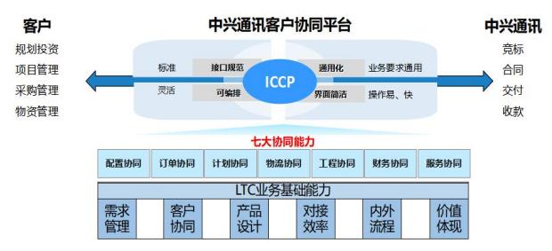 從 2019 年開始 ,中興通訊搭建了客戶協同平臺( iCCP ) ,形成了與客戶之間的配 置協同、訂單協同、計劃協同、物流協同、財務協同、工程協同、服務協同等七大協同