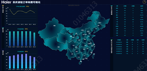 訂單可視化地圖顯示訂單完成率,這里曲線圖展示近7日訂單的完成率,并在曲線圖上面顯示近七日平均訂單完成率;發(fā)貨率展示近7日的成品發(fā)貨完成率,并在柱形圖上面顯示;柱形圖上面顯示近7日平均到貨率;訂單完成明細可以展示當(dāng)天到每個省級工貿(mào)地,各自的訂單應(yīng)發(fā)數(shù)和未發(fā)數(shù),以及發(fā)貨完成率。昨日訂單完成率報警展示昨日發(fā)貨完率不及100%的列表信息,從左到右列表:訂單編號、工貿(mào)、訂單數(shù)、已發(fā)和完后率。地圖訂單分布點擊或者光標(biāo)放置到中國地圖某個省份,會出現(xiàn)該省份當(dāng)日訂單發(fā)貨信息。例如,光標(biāo)放置到山東省,會自動彈出訂單發(fā)貨信息:訂單數(shù)、未發(fā)數(shù)和完成率。