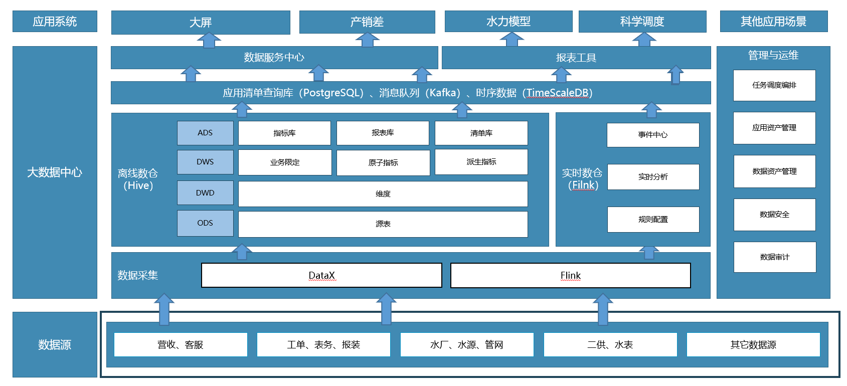 建設(shè)全面覆蓋公司生產(chǎn)、管網(wǎng)輸配、二次供水、營(yíng)銷客服體系的大數(shù)據(jù)中心和大數(shù)據(jù)應(yīng)用平臺(tái),實(shí)現(xiàn)大數(shù)據(jù)標(biāo)準(zhǔn)體系建設(shè),實(shí)現(xiàn)水務(wù)多領(lǐng)域數(shù)據(jù)融合,單一來(lái)源數(shù)據(jù)價(jià)值挖掘空間狹窄,更多數(shù)據(jù)價(jià)值創(chuàng)造將依賴多源數(shù)據(jù)融合,建設(shè)大數(shù)據(jù)中心為基礎(chǔ)的統(tǒng)一的數(shù)據(jù)標(biāo)準(zhǔn)體系,從而實(shí)現(xiàn)數(shù)據(jù)全面共享,標(biāo)準(zhǔn)化交換和價(jià)值挖掘,提升公司綜合運(yùn)營(yíng)管理能力。通過(guò)大數(shù)據(jù)標(biāo)準(zhǔn)化數(shù)據(jù)模型,實(shí)現(xiàn)各個(gè)業(yè)務(wù)系統(tǒng)數(shù)據(jù)全面共享,沉淀數(shù)據(jù)資產(chǎn)和共性能力,以平臺(tái)+應(yīng)用的建設(shè)模式,最終實(shí)現(xiàn)數(shù)據(jù)資源集約化利用,提升公司數(shù)據(jù)管理能力。