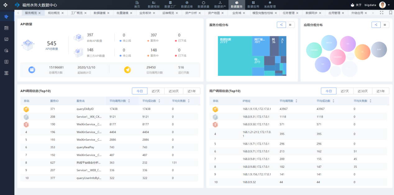 大數(shù)據(jù)中心為福州水務(wù)智慧大腦提供5個(gè)接口,其中4個(gè)接口直接從大數(shù)據(jù)中心的數(shù)據(jù)倉(cāng)庫(kù)中獲取用戶、工單、停水等數(shù)據(jù),為集團(tuán)總覽板塊、供水總覽板塊和營(yíng)銷客服板塊提供數(shù)據(jù)支撐。1個(gè)接口在大數(shù)據(jù)中心注冊(cè)、轉(zhuǎn)發(fā)和管理。接口每日訪問(wèn)量合計(jì)20次以上,接口調(diào)用成功率100%,接口平均調(diào)用時(shí)長(zhǎng)約0.5秒。