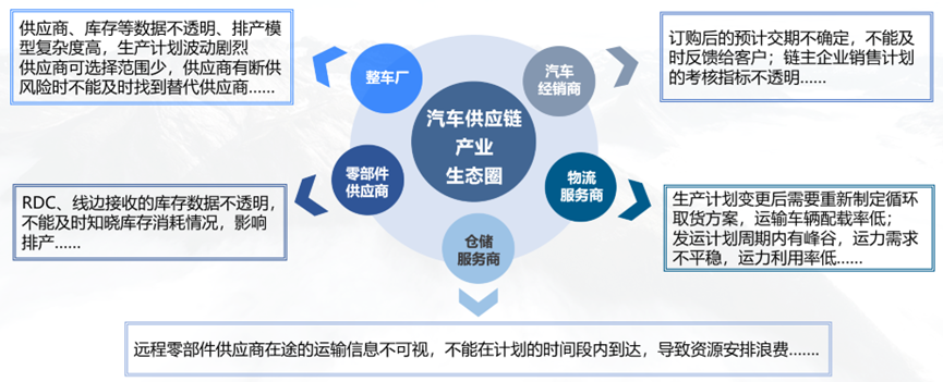 當今數字化浪潮下,汽車供應鏈沿著“傳統供應鏈——數字供應鏈——智能供應鏈”路徑方向發展。企業數字化轉型需求日漸突出,鏈上企業協同效率低成為汽車產業高速發展瓶頸之一。存在供應鏈業務協同效率低、業務協同成本高、企業數字化轉型水平不均、協同業務鏈條短、企業供應鏈協同發展意識薄弱等問題。