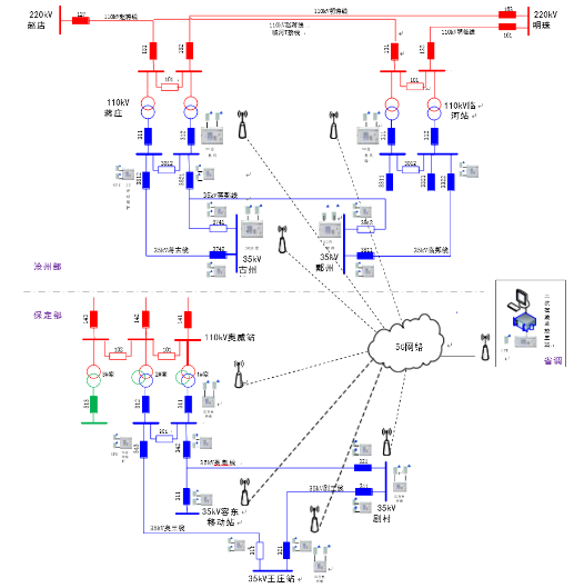 保定部分工程基于5G通信既實現(xiàn)上下級備自投(110kV奧威站的站域備自投與35kV劇村站和35kV王莊站的區(qū)域備自投)動作時間的優(yōu)化配合關系,又實現(xiàn)了35kV劇村站和35kV王莊站之間的區(qū)域備自投。