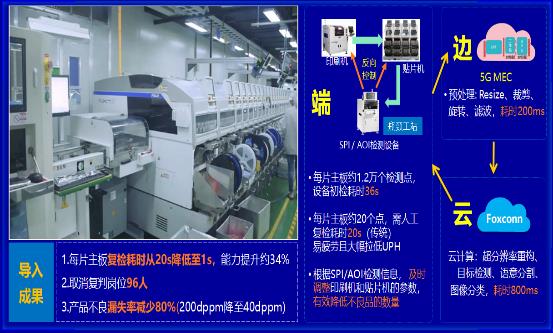 通過5G+AI構建機器視覺智能檢測,解決單機運算資源不足與云端計算網絡延時問題,實現端邊云協同毫秒級響應處理,提升檢測效率與品質,單日產出可增加24,000片,復判人力節省96人,不良漏失減少80%。