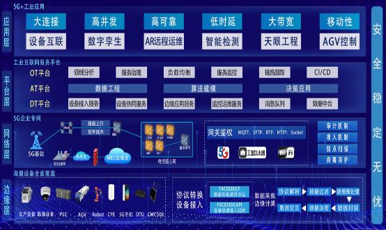 項目總體規劃部署服務工業互聯網的5G基站6個,邊緣計算(MEC)平臺1個,智慧綜合業務接入區1個,部署 5G 終端模組10套。充分利用現有平臺資源,構建多系統融合可擴展的DT(采集與邊緣處理平臺)、AT(經驗知識模型平臺)、OT(工業互聯網應用平臺) 三大平臺,實現5G網絡、終端能力調用及監測,具備百萬級以上規模終端的接入管理能力。