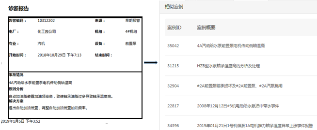 南京化學工業園熱電有限公司2018年10月29日從預警系統推送至診斷系統一條告警信息:“前置泵電機軸承溫度高”,診斷系統根據告警信息推薦的案例中詳細介紹了前置泵電機軸承溫度高的主要原因與處理方法,用戶參考推薦案例,判斷軸承溫度高的原因為潤滑油過量,通過調整自動加油裝置的加油頻率解決了該問題,而這一案例也作為新的案例進入了知識庫,當該問題再次發生時,診斷系統會立即推送該案例給用戶,起到知識傳承的作用,診斷過程參見圖16。