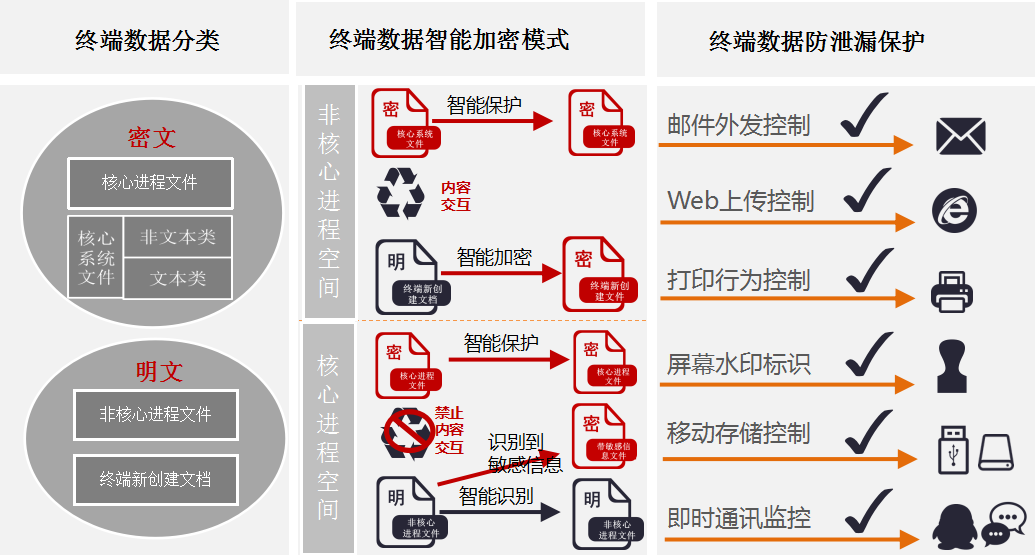 (1)終端數(shù)據(jù)智能安全防護(hù):包括數(shù)據(jù)智能安全子系統(tǒng)、終端虛擬化桌面子系統(tǒng)、終端桌面安全子系統(tǒng)、終端外設(shè)控制子系統(tǒng)、文件透明加密子系統(tǒng)等五個子系統(tǒng),有效防止機(jī)密信息泄漏。
