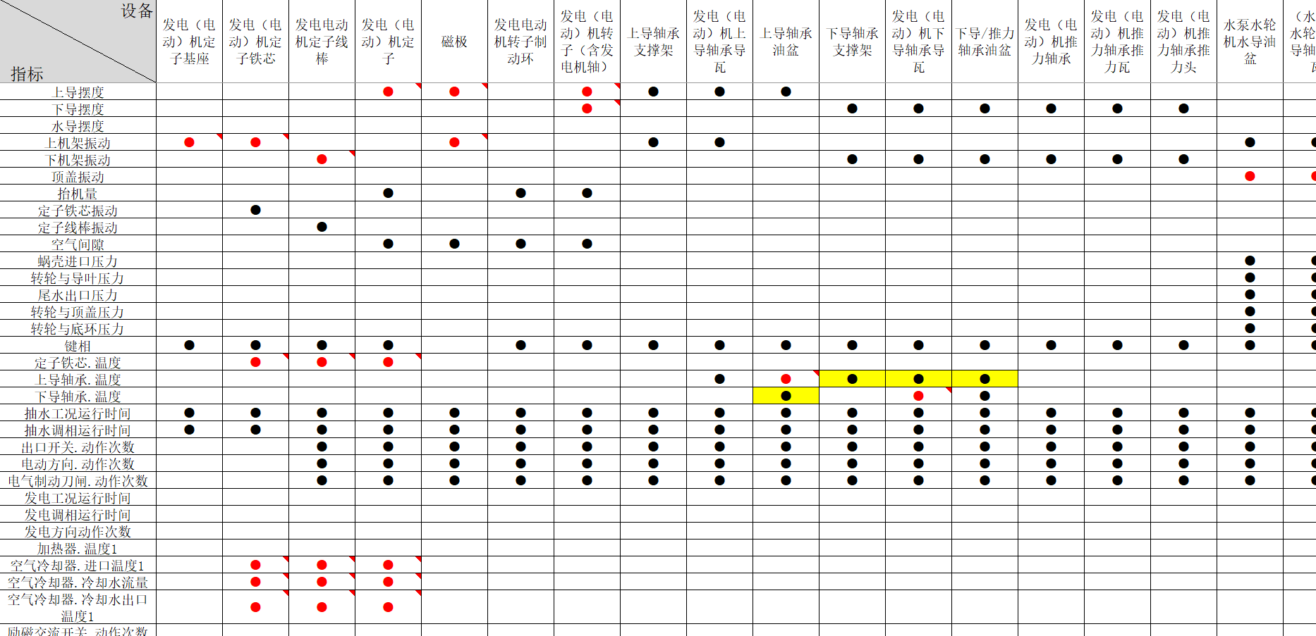 根據水電主設備傳感器波形數據進行分析,根據機組傳感器在不同工況下的數據采集規律、間隔密度等因素,對生產實時與狀態檢測數據進行歸集,通過相關性分析方法利用歷史數據,建立和分析設備各個參數之間的相關性,并整理出水輪發電機各設備部件傳感器數據的相關規律,結合水輪發電機組設備樹,形成設備指標關系矩陣。