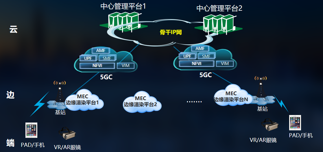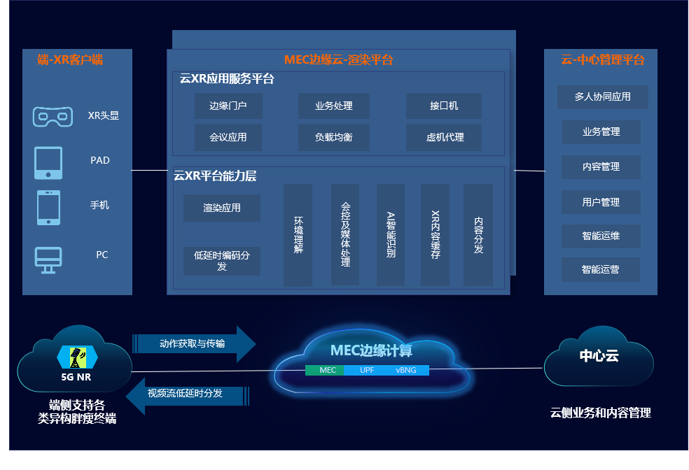 基于在5G、XR技術(shù)等方面的雄厚積累,中興通訊推出了以PAD/手機(jī)/VR和AR眼鏡客戶端、邊緣云XR渲染平臺(tái)和中心云管理平臺(tái)為主體的三級(jí)系統(tǒng)架構(gòu)設(shè)計(jì)。系統(tǒng)具備故障弱化能力,在中心管理平臺(tái)不可用的情況下,保證現(xiàn)有的邊緣服務(wù)不中斷。系統(tǒng)利用邊緣云XR渲染平臺(tái)計(jì)算能力,釋放終端壓力,保證XR順暢運(yùn)行,改善體驗(yàn)。
