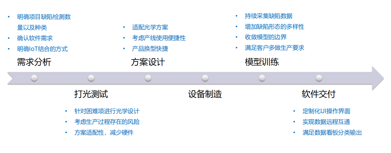 項目的實施過程經(jīng)歷了需求分析、打光測試、方案設(shè)計、設(shè)備制造、模型訓(xùn)練、軟件交付等6個階段。
