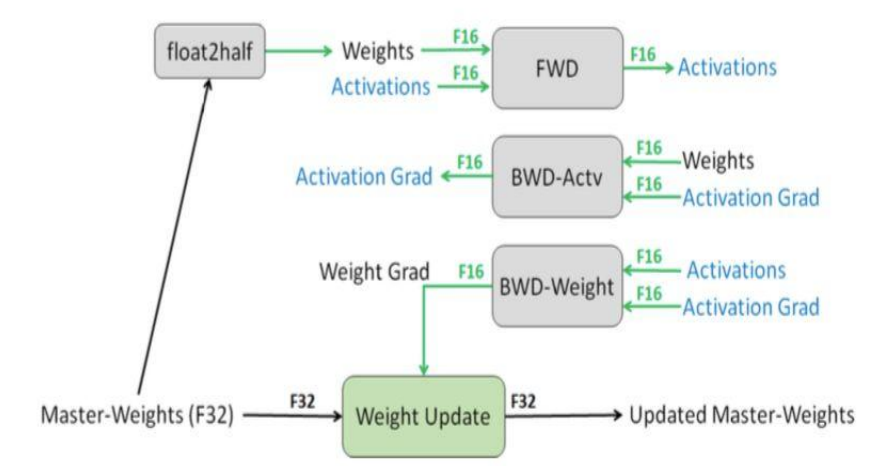 在訓(xùn)練過程中,綜合考慮模型的訓(xùn)練速度和精度,如果使用全精度模型,會導(dǎo)致訓(xùn)練速度慢、顯存占用高等問題,但是使用半精度模型,會大大降低模型精度,因此在訓(xùn)練過程中思謀使用了半精度和全精度結(jié)合的混合精度方案,即大部分模型使用半精度,但是對于一些敏感的部分使用全精度,這種兩種精度相結(jié)合的混合精度訓(xùn)練方式,可以將速度和精度的平衡達(dá)到最優(yōu)。在系統(tǒng)部署時,思謀全部使用了半精度模型,來達(dá)到最快的運行速度,并且相比較與之前的混合精度模型,不會有精度損失。算法精度方案如圖4所示。