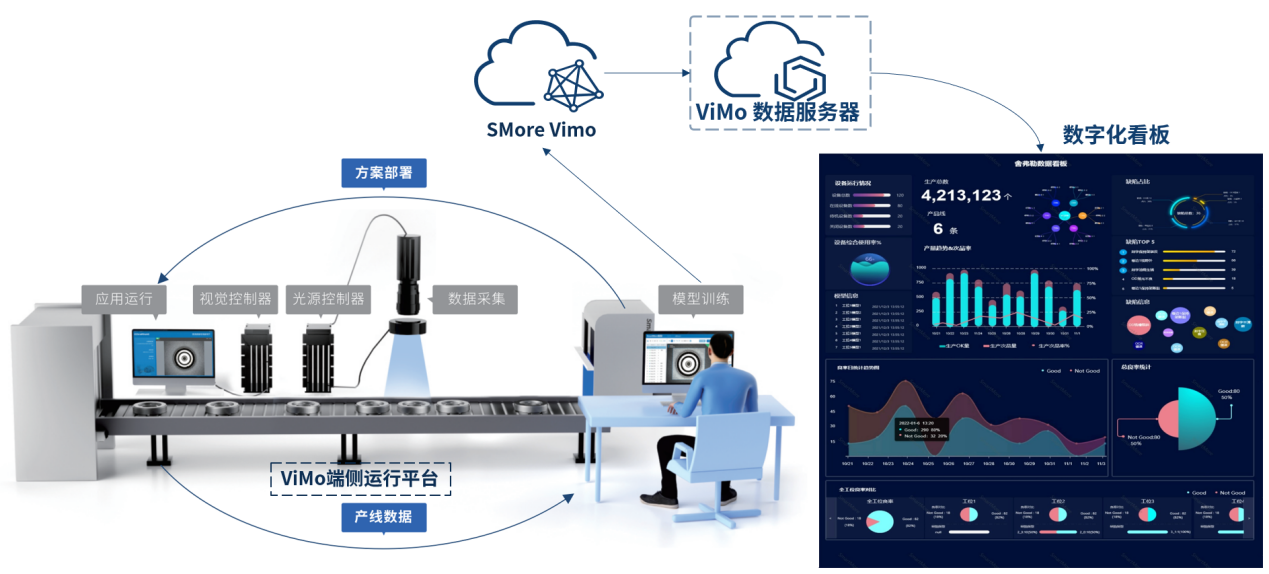 產(chǎn)線設(shè)備在生產(chǎn)過程種通過Vimo應(yīng)用程序,配合現(xiàn)場的相機、光源、PLC等對實時生產(chǎn)的產(chǎn)品進(jìn)行質(zhì)量檢測,檢測的相關(guān)數(shù)據(jù)(圖片、檢測結(jié)果、缺陷類型等)上傳到SMore Vimo,進(jìn)行AI模型訓(xùn)練,處理后的數(shù)據(jù)通過ViMo數(shù)據(jù)服務(wù)器進(jìn)行數(shù)字化看板展示。基于不同的缺陷,思謀的AI技術(shù)進(jìn)行數(shù)據(jù)獨立存儲管理,一方面可以更有效的真的某種缺陷進(jìn)行數(shù)字增量強化,又可以更好的為管理層提供高效的管理決策依據(jù),優(yōu)化生產(chǎn)。