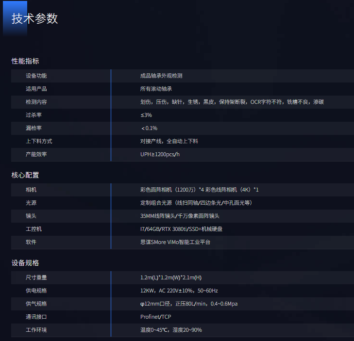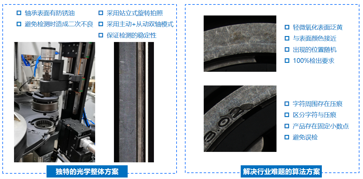 攻克了兩大行業(yè)難題——對生銹缺陷的精準(zhǔn)識別,以及對臟污、壓傷缺陷的精準(zhǔn)區(qū)分,實現(xiàn)了視覺技術(shù)在軸承檢測應(yīng)用的新突破。方案兼容超過20種產(chǎn)品型號,可一次識別23種缺陷,檢出≥99.59%,過檢率≤5%,檢測水平領(lǐng)先行業(yè)。(2)實現(xiàn)百分百人力替代