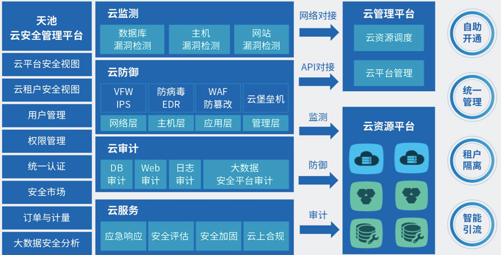 對各種安全能力集中管理調(diào)度,結(jié)合大數(shù)據(jù)分析,為云租戶提供安全視圖,可對云資源實(shí)現(xiàn)整體安全感知。