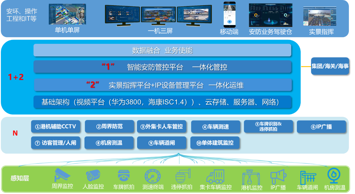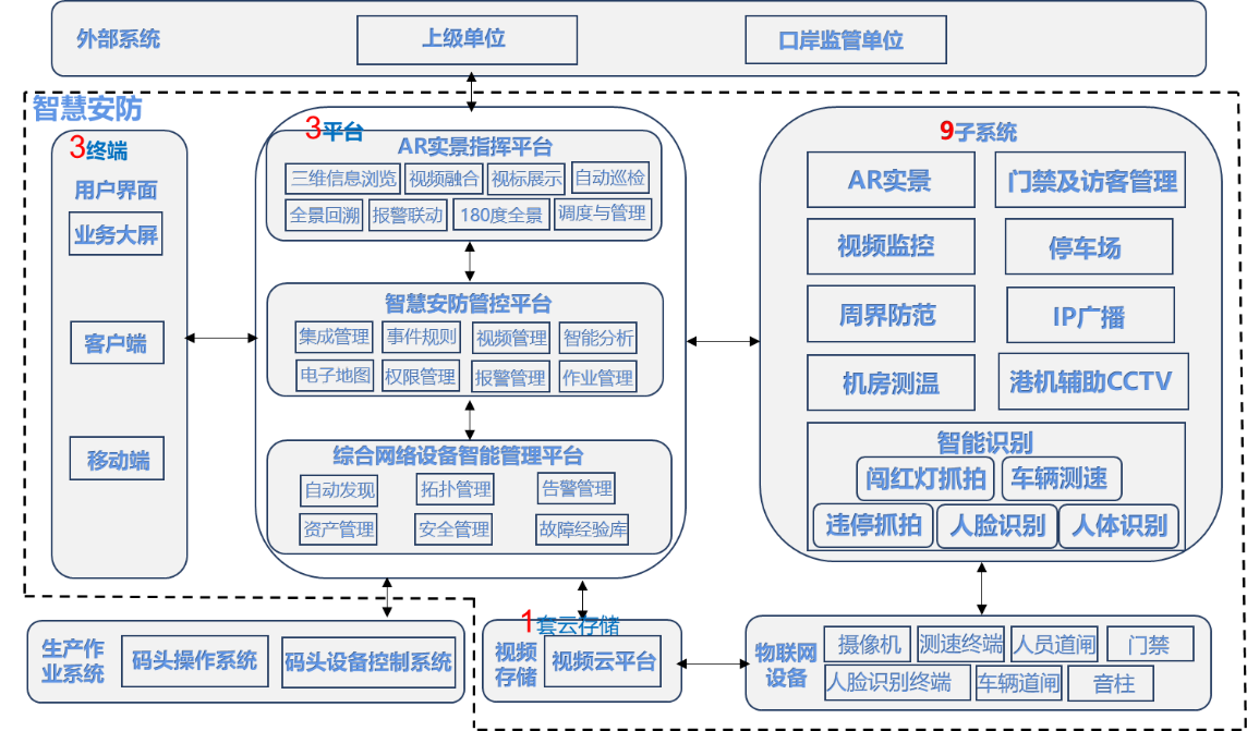 3、子系統(tǒng):“N”個子系統(tǒng)包括AR實景、視頻監(jiān)控、周界防范、門禁及訪客管理、智能識別(闖紅燈抓拍、車輛測速、違停抓拍、人臉識別、人體識別)、停車場、IP廣播、機房測溫、港機輔助CCTV等。每個子系統(tǒng)都具有特定的功能和任務(wù),用于監(jiān)控和管理碼頭的各個方面。