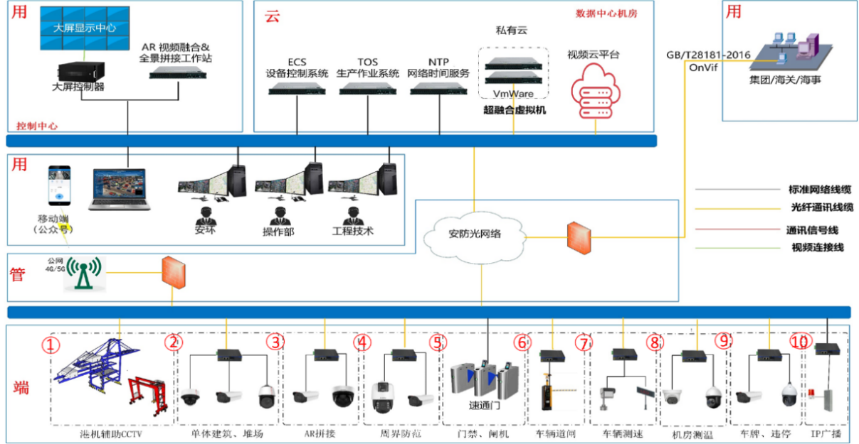 端:該層次對應(yīng)著碼頭的八種應(yīng)用場景,包括堆場(U型通道)、輔建區(qū)、單體建筑、港機、周界、道路、閘口、停車場等。在每個場景中部署相應(yīng)的安防設(shè)備和系統(tǒng),以實現(xiàn)對該場景的監(jiān)控和安全防范。