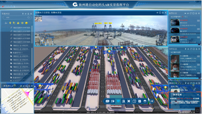 AR實景指揮平臺提供全景、全時空的三維可視化,用于指揮和監(jiān)管碼頭的整體運行情況。