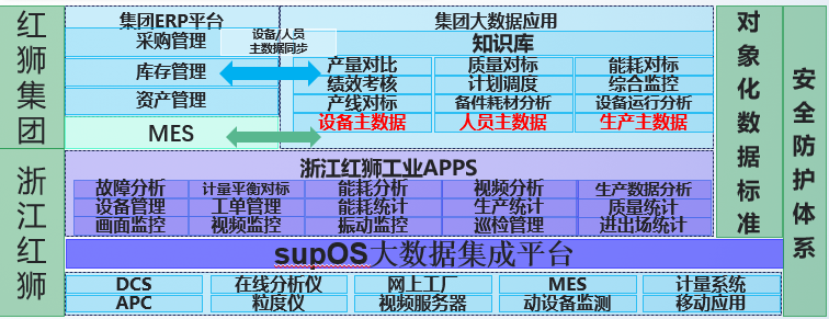 方案采用supOS平臺作為紅獅集團各個分廠的生產(chǎn)管控平臺,以ERP、MES、EAM的基礎(chǔ)數(shù)據(jù)作為主數(shù)據(jù),搭建多維度的工廠模型,對接ERP的人員、組織、崗位,EAM的設(shè)備、附屬設(shè)備、備品備件及MES的生產(chǎn)、質(zhì)量以及能耗等基礎(chǔ)數(shù)據(jù),并對廠區(qū)的DCS、PLC、視頻及各個智能儀表、儀器進行數(shù)據(jù)實時采集。融合多維工廠模型框架黏附工廠在生產(chǎn)管理過程中產(chǎn)生的業(yè)務(wù)數(shù)據(jù)及生產(chǎn)運行過程中的實時數(shù)據(jù),通過機器視覺技術(shù)對工廠在生產(chǎn)過程中進行實時監(jiān)測、分析、預(yù)警并作出輔助性決策;通過海量的生產(chǎn)工藝數(shù)據(jù)及質(zhì)量數(shù)據(jù),利用大數(shù)據(jù)技術(shù)實現(xiàn)對水泥成品強度的預(yù)測以及對產(chǎn)品相關(guān)質(zhì)量指標(biāo)的軟測量;通過專家系統(tǒng)提升余熱發(fā)電量,降低生產(chǎn)能耗,達到節(jié)能減排增效的目的。