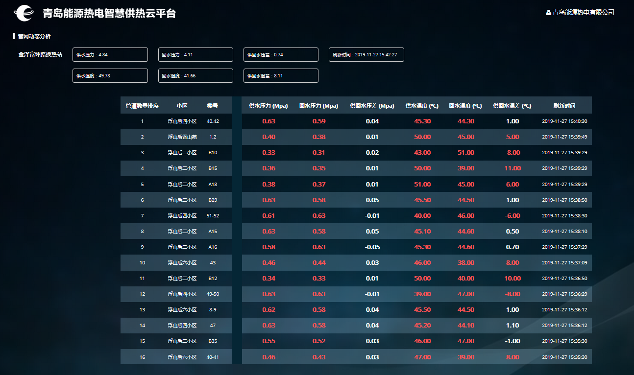 智慧供熱云平臺能夠提供基于專業(yè)供熱數(shù)據(jù)的大數(shù)據(jù)挖掘與可視化分析展現(xiàn)功能,通過整合熱源、換熱站、管網(wǎng)、氣象、熱用戶數(shù)據(jù)及客服系統(tǒng)反饋信息,形成全熱網(wǎng)統(tǒng)一的大數(shù)據(jù)挖掘分析平臺,幫助青島能源熱電有限公司及下屬熱力分公司掌握全熱網(wǎng)供熱各個環(huán)節(jié)運營狀況及客戶滿意度,通過整合現(xiàn)有粗放、零散、低效的數(shù)據(jù)資源,實現(xiàn)熱網(wǎng)的統(tǒng)一信息化協(xié)調(diào)監(jiān)管,針對性改善服務質(zhì)量,提供個性化服務,為節(jié)能降耗、運營管理和日常運作提供重要指導和支持。