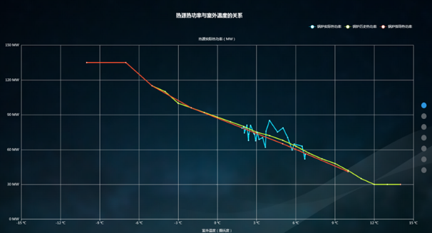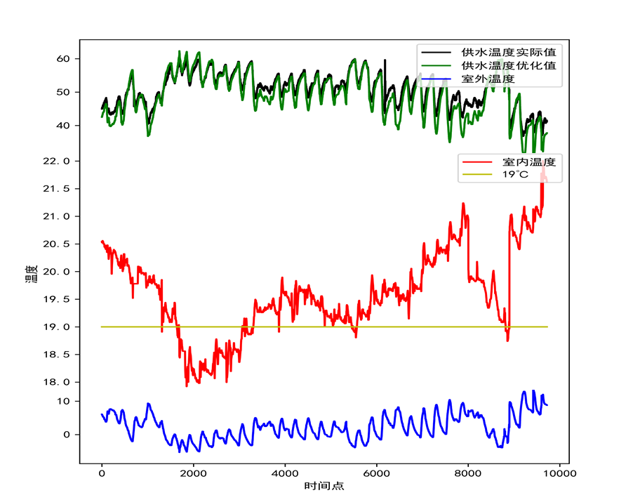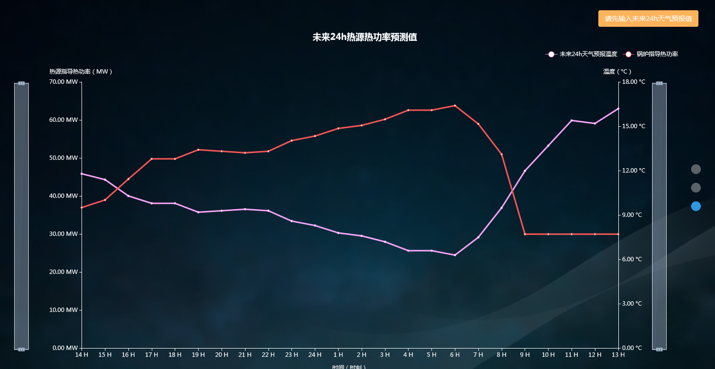 基于大量歷史數(shù)據(jù),得出一次網(wǎng)供熱溫度在不同工況下的純延遲與慣性時間。基于熱源機理與數(shù)據(jù)驅(qū)動,建立精確的熱源預測模型,通過該模型得出熱源在室外溫度改變時,預測的熱源功率優(yōu)化曲線。進而保證合理的供熱量,保證換熱站的熱量供給,如下圖所示。
