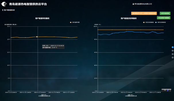 提供室溫合格率與室溫的可視化,通過數(shù)據(jù)脫敏,實時監(jiān)測供溫質(zhì)量情況,包括均溫,達標率,有利于運行管理粗,如下圖所示。