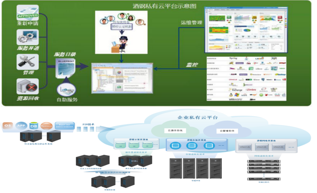傳統(tǒng)工業(yè)模式與改造后新模式的對(duì)比描述 | 酒鋼信息中心依據(jù)云計(jì)算技術(shù)架構(gòu)和發(fā)展趨勢(shì),結(jié)合酒鋼實(shí)際情況,搭建完成甘肅省首家工業(yè)私有云平臺(tái),使得酒鋼數(shù)據(jù)中心真正從傳統(tǒng)數(shù)據(jù)中心轉(zhuǎn)型升級(jí)到綠色節(jié)能云數(shù)據(jù)中心。 酒鋼從傳統(tǒng)數(shù)據(jù)中心向云數(shù)據(jù)中心的發(fā)展演變圖如下: